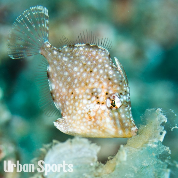 カワハギ科でもっとも小さな魚種ではないでしょうか。体色は変幻自在で緑の藻に居るときは緑色に、茶色い岩礁に居るときは茶色に、と瞬時に色を変えます。名前の由来通り編み目模様があり体型は菱形。