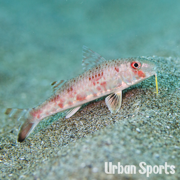 体色模様の赤色斑点は濃い薄い個体差が多いです。背びれに2本の赤褐色縞が入って背中は黄褐色です。ヒメジ科の種はアゴから出ている黄色いヒゲが特徴でこのヒゲで水底に隠れている小さな甲殻類などを探しています。水温がぐっと高くなる夏に砂地でよく見かけます。