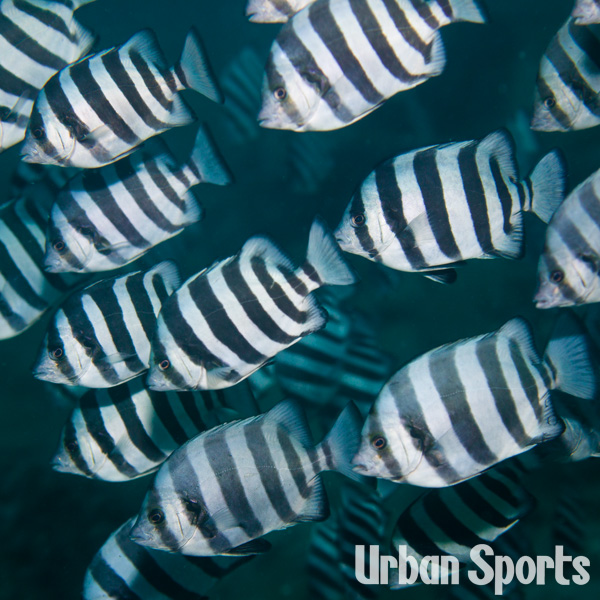 イシダイの成魚は体長50cm以上にもなり横縞が無く灰色で口のまわりだけが黒くなります。飛島でごく稀に成魚を見かけることがありますが通常見られるのはシマシマ模様のイシダイ幼魚。白い部分が黄色の種もいます。