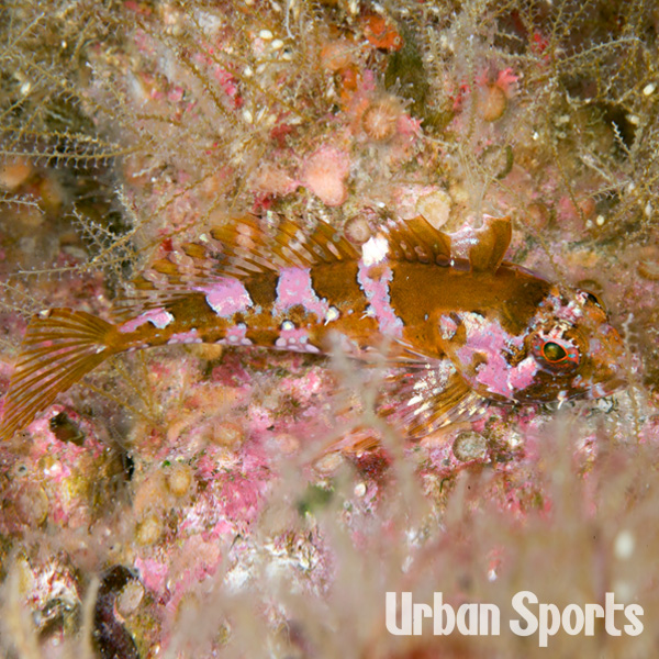 | 同じ仲間のベロや特にサラサカジカとは識別にとても迷う種。生活圏で体色や模様、成魚や幼魚などで特徴が似てしまうのではないだろうか。頭部目の上に皮弁があり、臀ひれが13~15とサラサより少ない。第1背びれと第2背びれが独立し第1背びれの1番が長く欠刻がある。 |