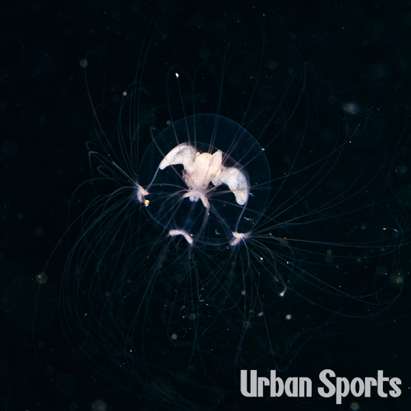 花クラゲ目のクラゲの中では小さな種、ドフラインってそのまま学名をカタカナ読みにしたようでしらべてみたらドイツの研究者の名前。触手は傘の下縁から等間隔で出ているのではなく四隅から伸びている。