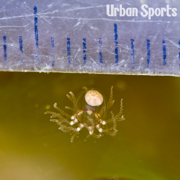浮遊もするが海藻に着いていることが多い。黄色(ピンク色)い円筒形の内部が特徴で触手は泡のような点々状になっている。