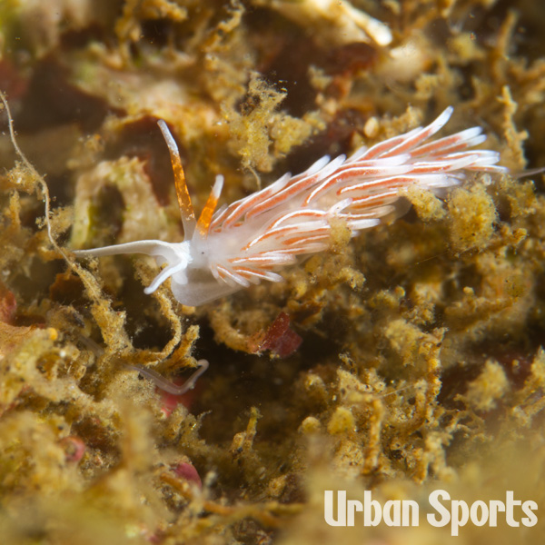 | 冷水域を好むウミウシ。水温が高くなる庄内では大きく成長することはなく0.2~0.5mm程度の小さなサイズが多く観られる。体色は白ぽい半透明、触角は橙色で口触角に白いスジが入っています。背側突起は体色に鮮明な赤色と白いスジが入っています。サイズの割には目が大きいです。 |