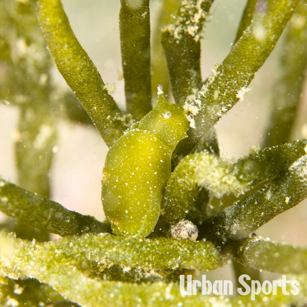 ヒラミル(海藻)を好み生息しています。タマミルウミウシ同様に擬態しているのか体色が生活しているヒラミルと同じ色。触角先端は白くなっている。庄内の全ポイントでみることができます。