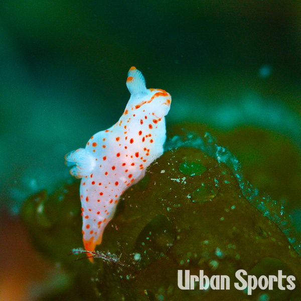 体色は半透明な白色で赤ぽっいオレンジ色の斑点がある。触角と鰓先端には斑点と同じ色が先端に付く。体色や斑点の色の薄い透き通っている個体も時々見かける。