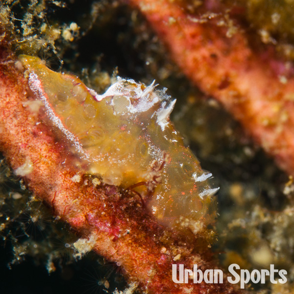 | おそらくべッコウヒカリウミウシだとは思うが決定的な特徴が移せなかった。この年初の四島、肉眼では識別不能な大きさのウミウシ。体色は半透明の黄(ベッコウ)色、体表にはオレンジ色の斑紋。外套縁および尾部正中線上に白色の小さな突起が並び触角の色は体地色と同じで、褐色班と白色班が入る。褶葉の先端が乳頭状に尖り二次鰓は3分岐する。 |