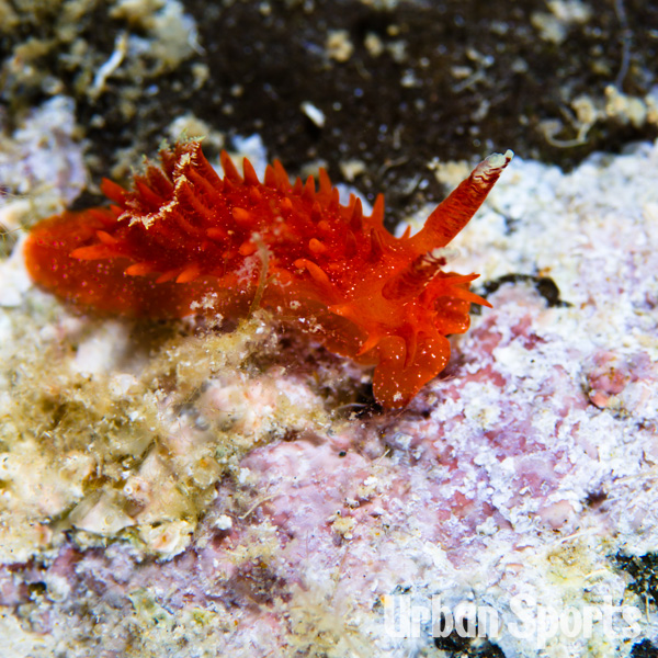 体色は濃い赤色で背面に体色と同じ色の突起がある。触覚と鰓の先端だけが乳白色。