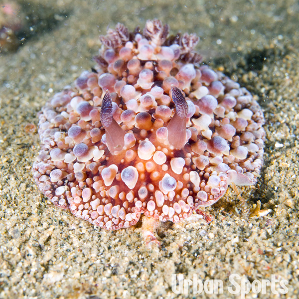 背面のイボイボはゴムのような触感で弾力性がありる。見た目は健康サンダルのような風貌。比較的大型サイズのウミウシで水底を動き回っています。