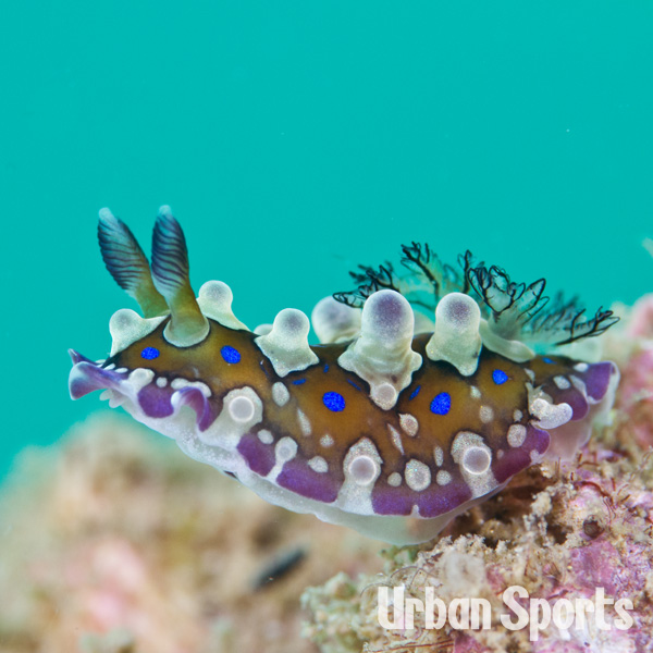比較的大型のウミウシ。茶黄色な体色に背面には大きな突起があり触角の先端と鰓が紫色の褐色で外套膜の縁にも同じ色が縁取られている。
