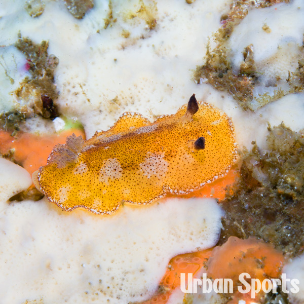 大型サイズになるネズミウミウシにしてはちょっと小さめの2cm、幼体だろう。外套膜(背中)が広く体色は淡黄色。暗褐色の点々がまばらにあり白い斑点模様が左右に2~3対あるのが最大の特徴。
